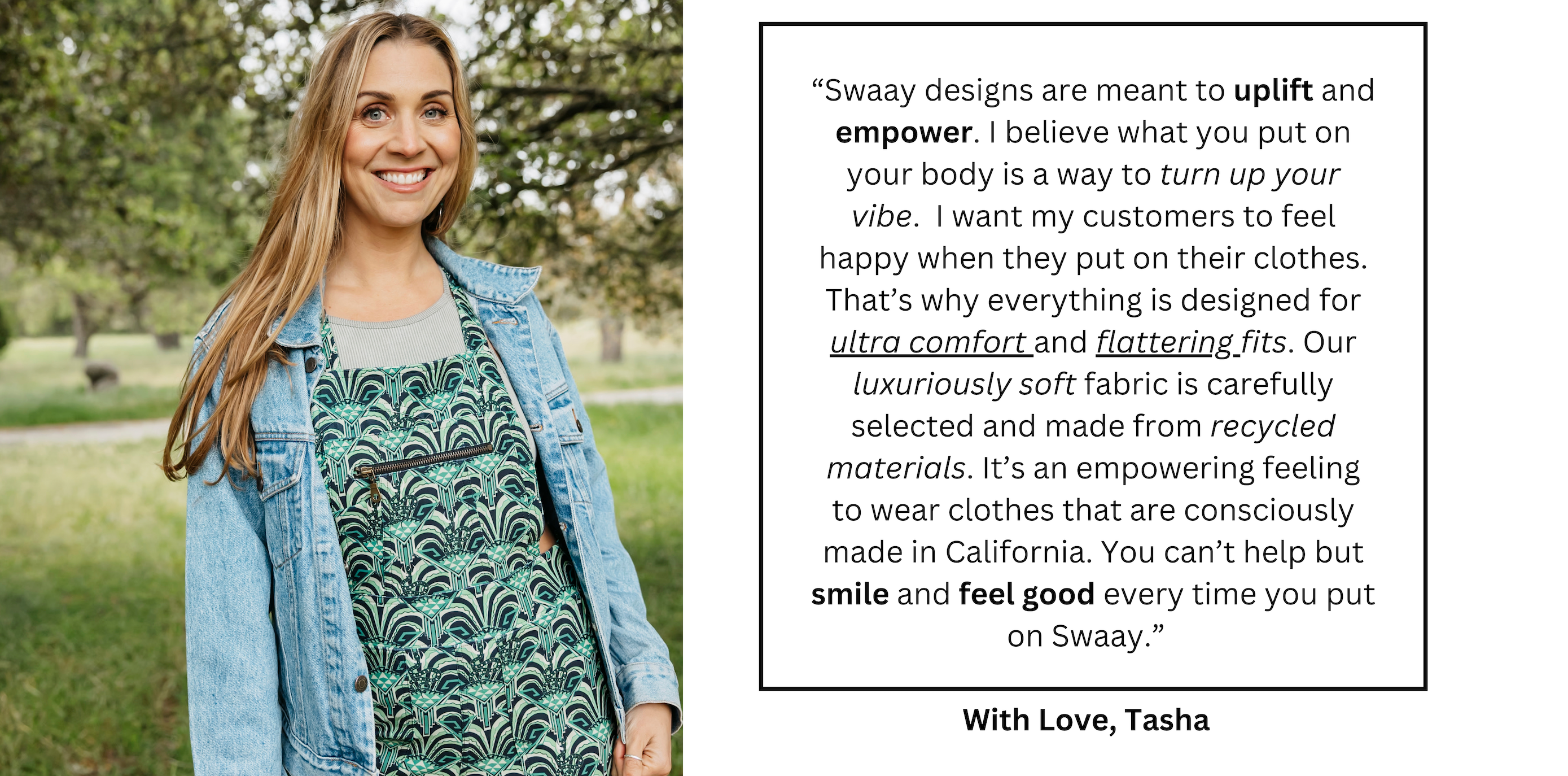 As soon as I put these on, I knew it was a big YES! The material is super soft, stretchy and comfy. But unlike other materials that fit that description, these feel like they will last and be quite durable. Can’t wait to play with all of the style possibilities! The adjustable straps are perfect. Just found my fave pair of pants for Fall. And ethically produced in California…doesn’t get much better than this. Thank you Swaay!